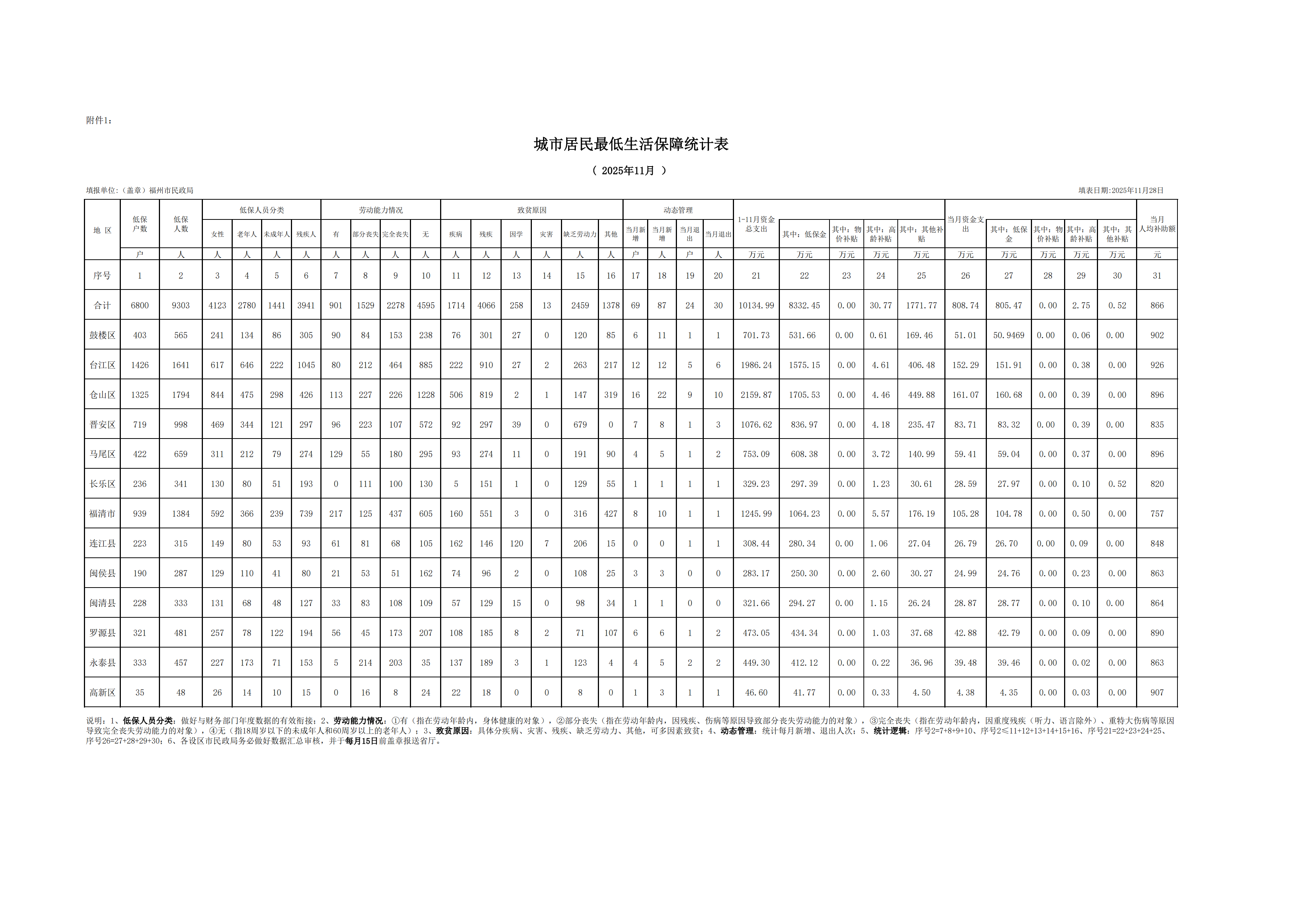 2025-11福州市城市居民最低生活保障统计表