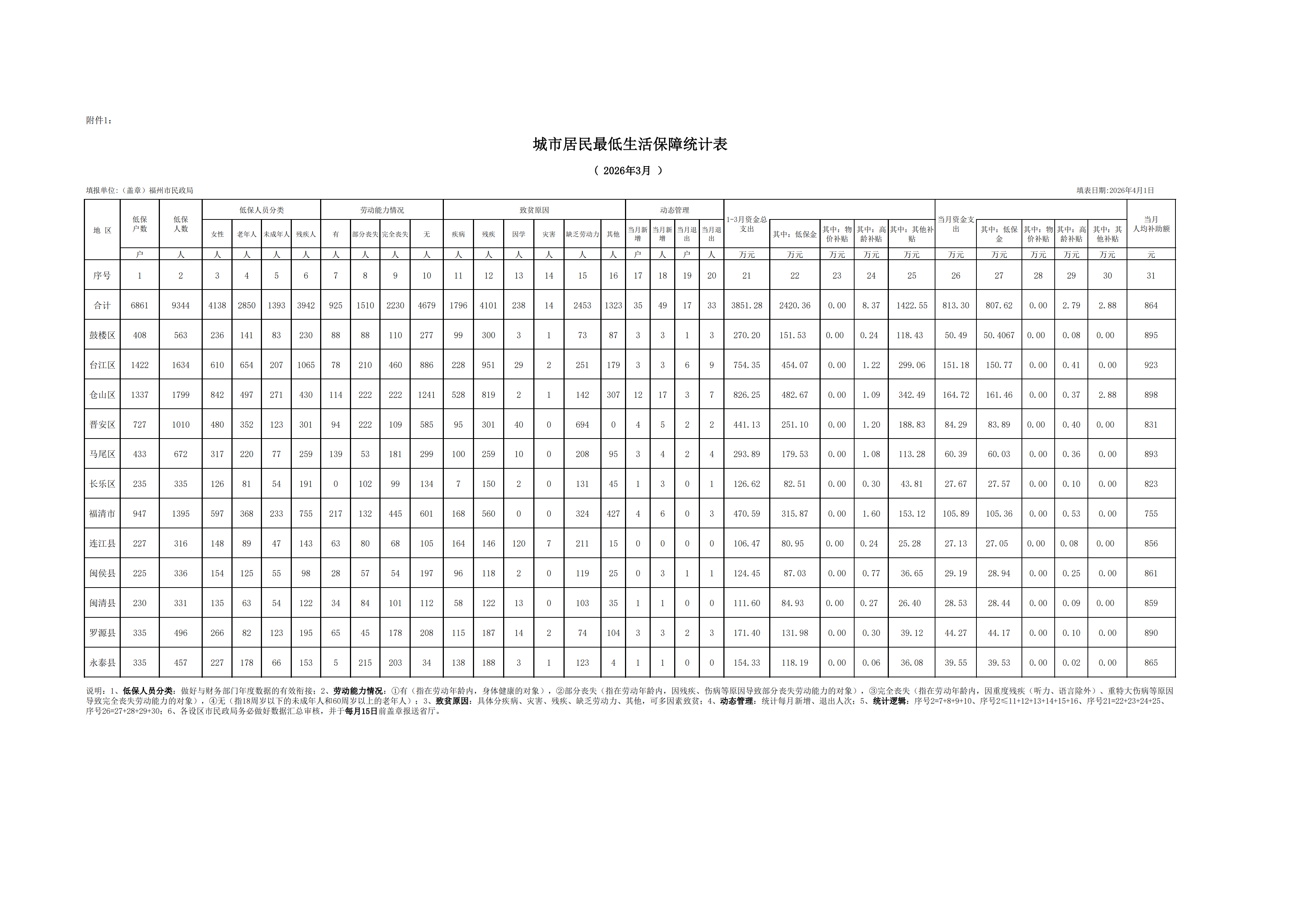 福州市城市居民最低生活保障统计表(2026年一季度)