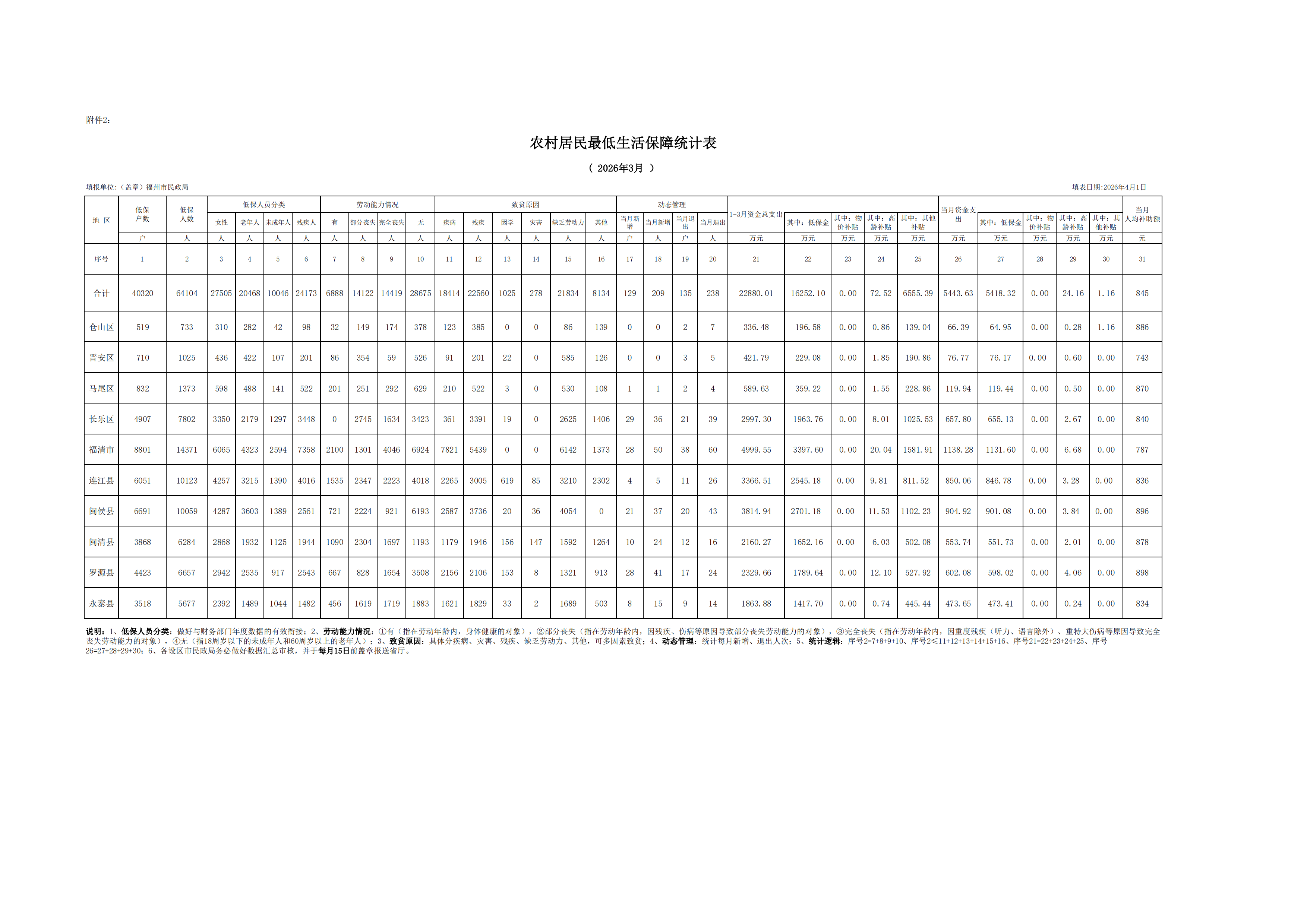 福州市农村居民最低生活保障统计表(2026年一季度)