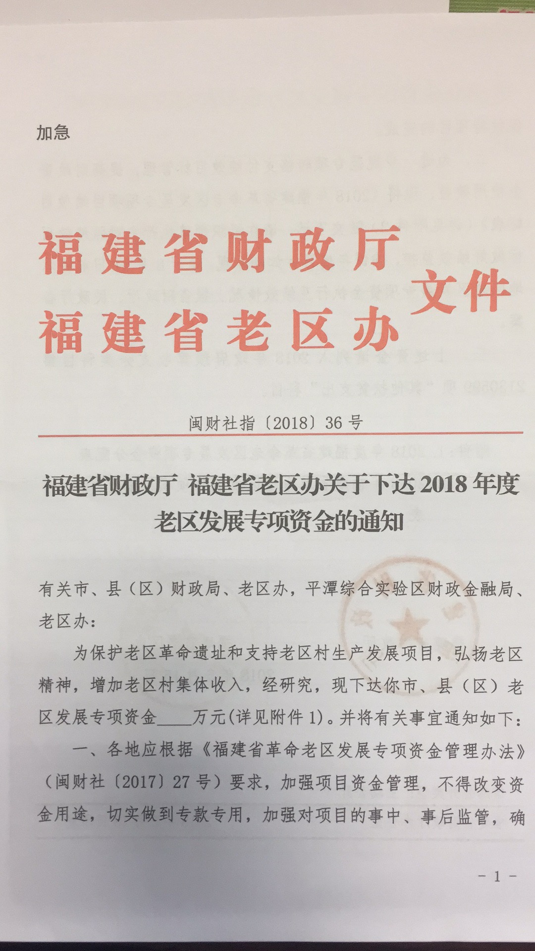 省财政厅、省老区办下达2018年老区发展专项资金