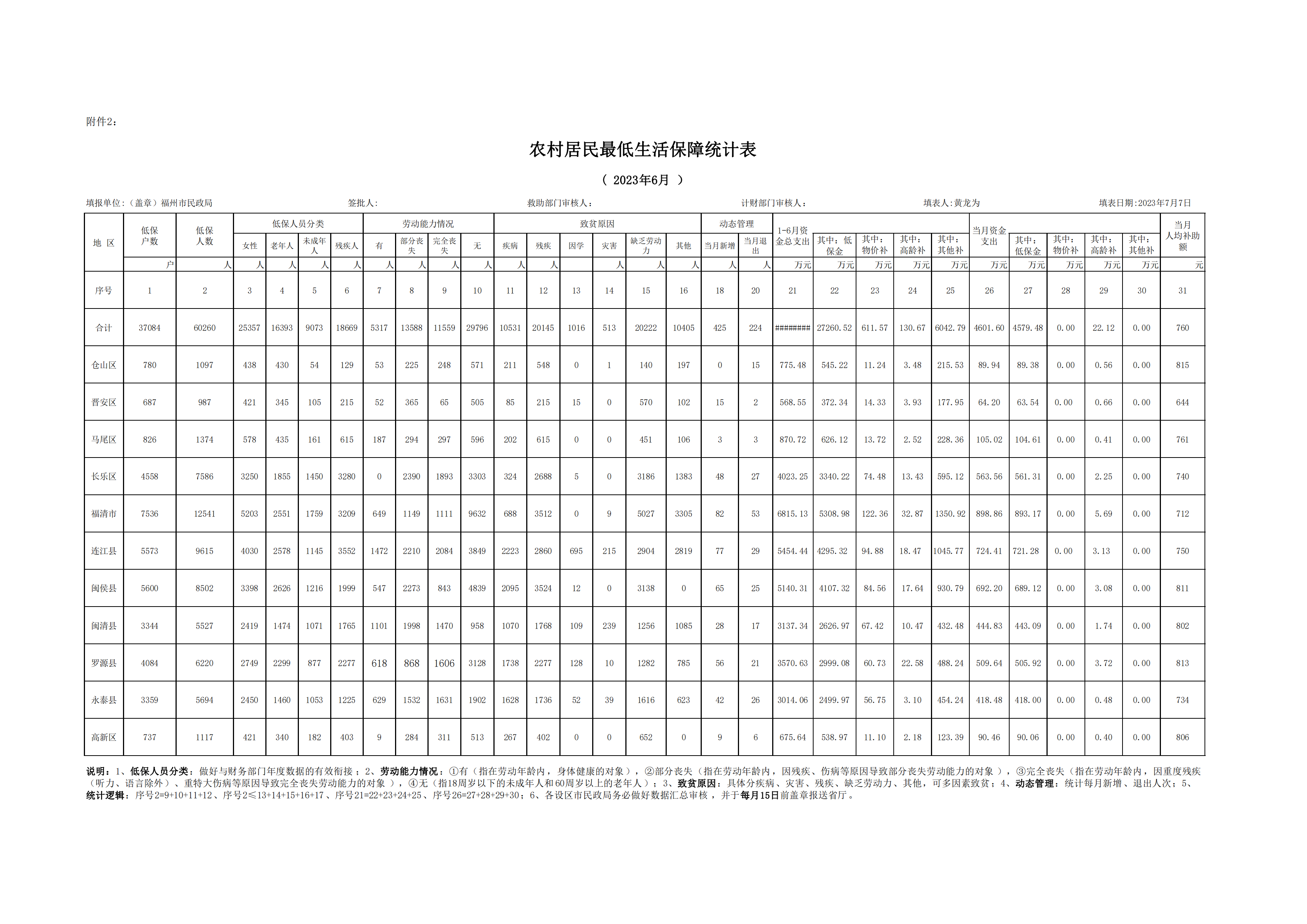 2023年福州市城市农村最低生活保障统计表(6月)